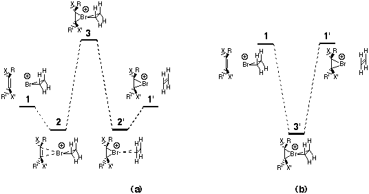 Ab initio calculations at the correlated MP2 and B3LYP/pVTZ level reveal that a bromine cation transfer between two alkenes involves a symmetrically 4-coordinated species which is an energy minimum in the gas phase energy profile. Electron withdrawing and donating substituents on one alkene distort the position of the bromine respectively away from and towards the substituted alkene. Alkenes strained by incorporating a trans configuration into 6-8 membered rings preferentially bind the Br cation, an equilibrium which can be tuned by using a combination of substituents and strain. The classification of such an atom transfer as a concerted coarctate reaction is discussed. Original publication: Internet Journal of Chemistry [online computer file] Volume: 4 Pages: No pp. given, Article No. 10 Journal 2001